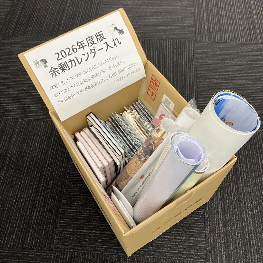 当社では、地域社会への貢献活動の一つとして、毎年年末年始に社内の余剰カレンダーを収集し、社会福祉団体へ寄付する活動を行っています。