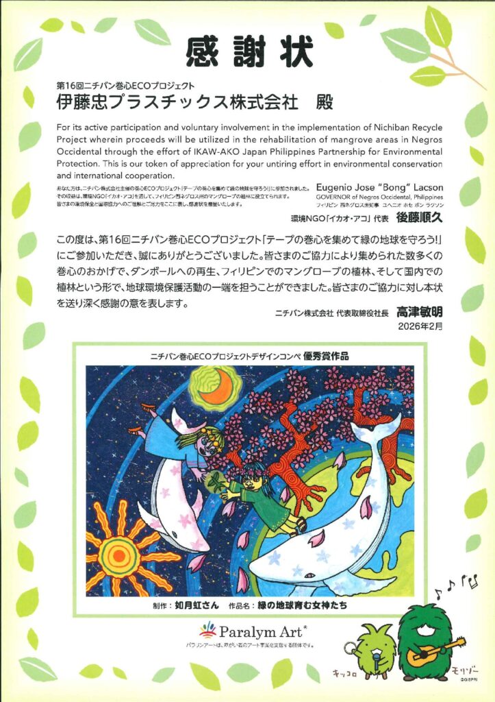 「ニチバン巻心ECOプロジェクト」とは、使い終わった粘着テープの巻心を回収し、段ボールのリサイクル資源として有効活用する取り組みです。リサイクルによって得られた利益金に加え、回収した巻心の個数に応じてニチバン株式会社から支援金が拠出され、フィリピンでのマングローブの植林や国内での植林活動の環境保全活動に役立てられています。